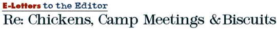 Dear SouthernReader: I do believe you have outdone yourself with your story Big Chicken. Although I have long known of big chicken stories, it is always impressive to see the spoken story translated to the written word. In fact, at the tender age of six I, myself was forced to lay waste to a pet Bantam rooster with a piece of pipe over just such an attitude toward other chickens, humans and dogs. You got to catch it quick or it will spread all over the barnyard. It is a sad story and one that can only be addressed with the most barbaric of measures. I guess chickens are just that way, but rebellion is always the same. The hook and the sword are the only sure cure. I also know about the Methodist and camp meetings. Every September the town I grew up in does just that--moves out to the wooden tents for a week of revival and reveille. Anything you want you can get, from religion in front of the tents...to a drink or a toss of the dice (or a toss of self) behind the tents. Finally...what can be said about the art of biscuits, save, it is an art. Now how about some fresh butter on those biscuits and little of that crab apple jelly...ain't but one thing better...and I haven't seen her in years. Steve Batson Dear SouthernReader: Thanks for steering me to your magazine. I just read Big Chicken and was quite entertained. Made me think of some chicken stories from my past. My family used to buy little colored Easter chickens at Sanderson's in Donelson (an eastern suburb of Nashville), usually four, one for each child. Then after Easter we would let them grow up in our back yard until my Dad would eventually wring their necks so my mom could fry 'em up for Sunday lunch. Donelson zoning was a tad loose. We had hens and roosters, and I was always amused to see the grown roosters, always white, but tinged on the feather edges with the Easter colors of purple or pink or lime green or orange. Did they look strange! And those roosters were very aggressive. They took no crap from anybody or anything. Especially not from the dogs. Just like the Big Chicken. Again, thanks for the story and for stirring up the memory banks. Keep me on your email list. I'm already a fan. Bob Goodwin Dear SouthernReader: I enjoyed the first edition of SouthernReader but wonder how much was fiction and how much was not. I can certainly relate to the Big Chicken 'cause Mom and Dad had an old rooster that used to chase my sister and me, and Mom had to take the broom to fight it off while she walked us to the outhouse. I was pregnant with my daughter, Debby at the time, and I was really afraid of the old bird. He got so bad that we finally had him with dumplings one Sunday for dinner. And, your camp meeting story (Loosening the Bible Belt) reminded me of when we lived in California. Every six weeks or so we would visit Yosemite National Park, and one summer we had our own camp meeting in the park with people from all over the country. As for biscuits (The Rising Popularity of Biscuits), they cant be beat, though I never could make them like my mom, grandmother and aunts. Even so, theres nothing better than a biscuit with a thick slice of tomato on it or some butter and homemade peach preserves or a hunk of country ham, or just sopping some brown gravy or sorghum molasses with one. Keep up the good work! Fran Trice |
