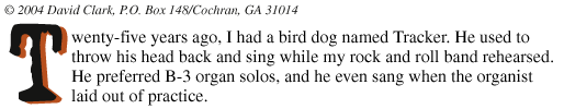 But the minute was over quickly, and we leaped up as the unit that we were and ran bent over double-like, which has got to be a comical thing to see, and we ran and pushed and hauled and Tracker was barking and trying to get on because he was a smart dog in his way and part of the gang and all and he had figured this drill out after having watched our miserable failure to begin with. And we ran and pushed for about twenty feet, and somebody hollered something and all of us dove onto this big piece of metal, which really meant we all dove for the center of it and this meant we all hit each other square on but it didn't matter because now we were immediately flying. I think it mattered just a bit to Tracker because he followed us in the dive, and he got sort of squished but someone grabbed him by the flappy part of his neck and we all squirmed around and found a place and by the time we looked up we were going down this hill very, very fast. And I truthfully think that if we could have stopped everything right then and taken a poll, all of us would have agreed it was too fast. I know for a fact Tracker would have just soon been watching from a stationary position. But you just don't stop a big-ass piece of metal from going down an icy snow-covered hill once it gets going, so we held on and hollered and held on and flew down that hill just like we were experts at the thing. Gravity has its advantages. It was one of those times when everything is going in slow motion while it's happening, like the way it happens when you go into a spin during a car wreck. About halfway down the hill, which means we were moving at a good clip, we hit a sort of raised up part that was really a little bitty cliff. We all knew that place was there but I think we all were operating under the mistaken illusion that we would be able to steer this stupid thing somehow. I know that sounds dumb, but we were stoned and that's just how folks think when they're stoned. And we went off that little rise and up through the air and it was great fun until a second or two later when that big piece of metal with six hundred pounds of young men and dog came flopping down on the cold hard ground and rock and cowpoop. It dang near knocked the wind out of all of us, but not quite, which was good because the hill veered off there and got even steeper and the rest of the way down that hill was as much fun as I've ever had in my life. It was long enough for each of us to look at each other in that way you look at someone when the world is perfect and a goal is reached and you all know you have defied gravity together. The funniest part was when we finally hit the bottom where it leveled out, and it sort of clunked to a stop. Old Tracker went rolling across the snow like a cattywhompus basketball dumped out of a basket. We laid in the snow and laughed hysterically for a long time. Then we had to drag that dang big-ass piece of metal back up the hill. Then we did it again and again and again all afternoon long. And Tracker rode with us every single time. Now all this happened before Tracker got hit by the car. When he got hit by the car, he laid up under the porch without moving for about three days. Then he finally crawled to the edge and ate a bit and crawled back under the porch. And I ground up brewer's yeast and zinc and vitamin C, and put it on his dog food. And he got well in about two shakes after I did that. A week later you'd never know he had been hit by a car going 70 miles an hour. And another year went by and one year later, almost to the day, I guess Tracker had to go down and celebrate his survival of the highway. Tracker and I were sitting on the porch. And all of a sudden Tracker jumped up and bounded off the porch and over the bushes, and I watched Tracker jump all of a sudden off the porch and run across the yard and under the fence and down the hill like he heard some sort of cosmic dog whistle. And Tracker ran down the hill and past the old well house in the bottom where our big-ass piece of tin ended up every time, and he shinnied under the fence the way dogs will do, and he bounded up the embankment. Out of the corner of my eye I could see a maroon Monte Carlo heading west, and I sat forward in my chair and then stood up, because I had a bad feeling about this whole business all a sudden. And Tracker bounded up that embankment as fast as he could go, and the Monte Carlo headed west about 70 miles per hour, and I'll be danged if I didn't stand right there and watch Tracker, the great old singing dog who was smart in his way but dumb in others, I watched Tracker run full throttle right into the right front fender of that Monte Carlo. The Monte Carlo's horn honked and he sort of swerved but he even never slowed down. And Tracker tumbled down U.S. 80 like he was falling off the big-ass piece of tin. I hauled butt down there in the truck, crying my eyes out and running the stop sign coming off my dirt road and almost getting hit by a woman from Crawford County. And getting out of the truck was another one of those slow motion things like the sled ride and the car wreck, because I was approaching my best friend in the whole wide world laying there with his head cut dang near all the way off by the sheet metal of the Monte Carlo fender. He looked at me one more time with that "what the hell?" look, and then he died with his head in my lap. I buried him out back in the garden. David Clark's website is www.outofthe sky.com |